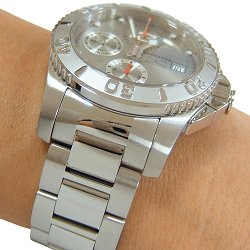 このモデルは、ステンレス製のエンボスベゼルを備えた機械式の自動巻きクロノグラフモデルの男性向けサイズです。